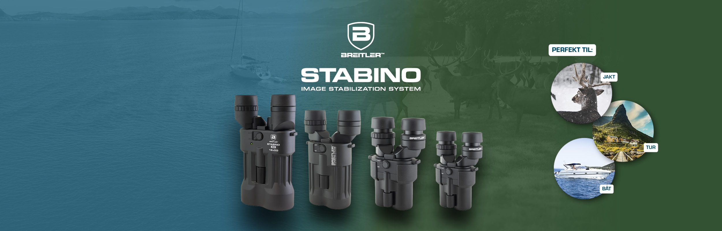 En kikkert med høy forstørrelse kan være vanskelig å holde helt rolig. Breitler Stabino stabilisatorkikkerter har innebygget stabilisatorsystem, dvs. at bildet i ­kikkerten, vil være helt rolig, uansett hvor ­vanskelig det er å holde kikkerten stabil. Tilgjengelig i flere ulike varianter.